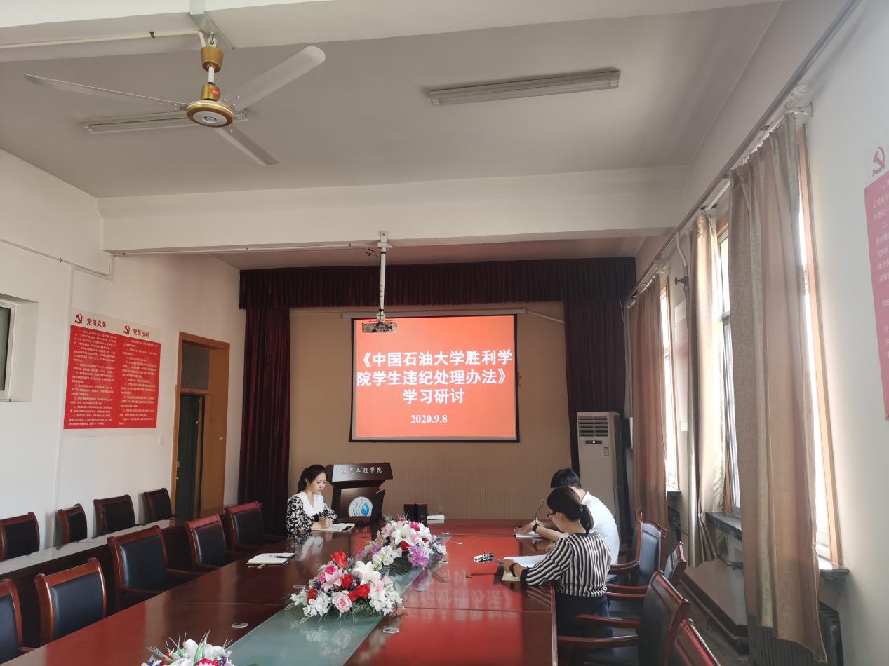 随后,全体学生工作人员集体学习了《中国石油大学胜利学院学生违纪处理办法》,并对现有学生违纪情况展开交流,强调对于违纪学生做好跟踪,要求各班级开主题班会对文件进行集体学习,确保学生安全稳定。