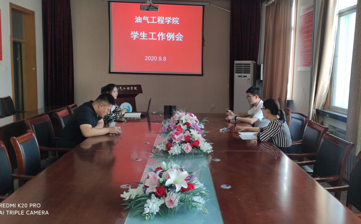 9月8日,油气工程学院在西配楼4004会议室召开了新学期学生工作例会。会议由党总支副书记李聪聪主持,辅导员伍佳慧、王成、李文强参加了会议。