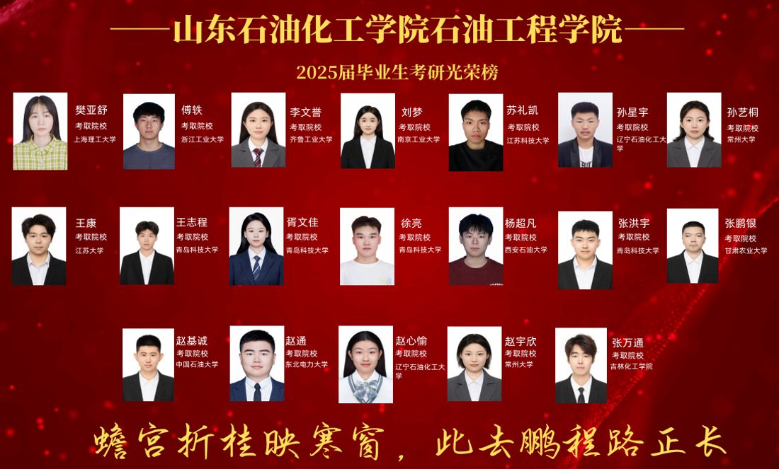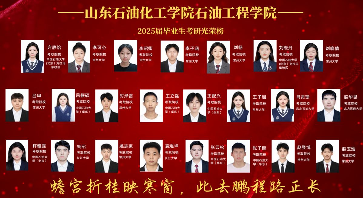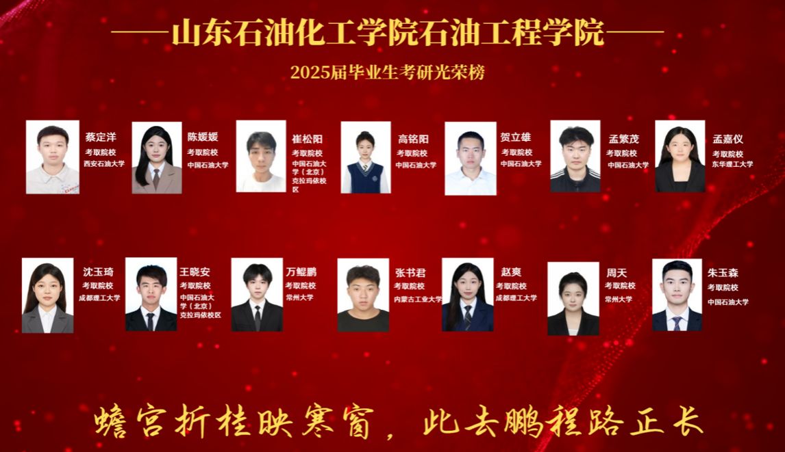 我院2025届毕业生91人考取硕士研究生,考研人数较去年实现大幅提升,考研率为20.68%,其中34人被中国石油大学(华东)、中国石油大学(北京)等“双一流”大学录取,占录取学生的38.2%。