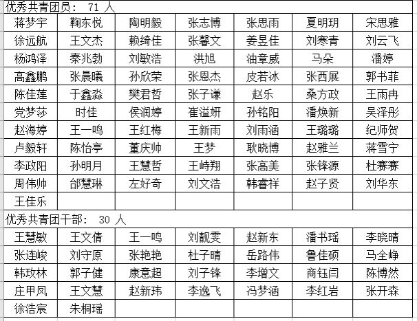 近期,为落实立德树人根本任务,坚持以德为先、能力并重、全面发展,树立大学生先进典型,引导和鼓励广大青年学生自觉成长为德智体美劳全面发展的社会主义建设者和接班,我院根据学校下发的《关于做好2024年度学生先进个人评选工作的通知》内容要求,按照校级优秀共青团员和校级优秀共青团干部的评选条件和办法,组织完成了该项评选工作。最终,经公示无异议后,确定蒋梦宇等71名同学为2024年度校级优秀共青团员,王慧敏等30名同学为2024年度校级优秀共青团干部。具体名单如下:
