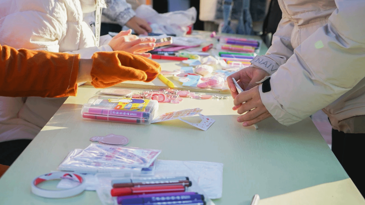 活动现场氛围热烈浓厚,吸引了众多同学踊跃参与。在活动专属摊位前,同学们有序领取贺卡与信纸,执笔伏案间,或倾诉对远方家人的深切牵挂,或书写对朝夕同窗的真挚祝福,或为素未谋面的校友送上暖心寄语。不少同学还精心搭配手绘插画、趣味贴纸,让每一份问候都独具匠心,成为承载心意的专属信物。