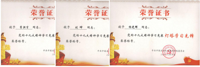 在党的生日来临之际,6月28日下午,学校在主楼501会议室召开庆“七一”暨党的十九大精神学习竞赛表彰大会,我院共获7项表彰,其中李洪言、杨光辉、刘坤3名老师获“灯塔学习先锋”,石油工程党支部、储运工程党支部和资源科学与工程党支部3个支部获“灯塔学习型党支部”,油气工程学院党总支获“优秀组织奖”。储运工程党支部教师李洪言、资源科学与工程党支部书记胡秋媛作为先进代表在会上交流发言,他们分别介绍了基层党建工作开展情况,分享了十九大精神学习竞赛的心得体会。
