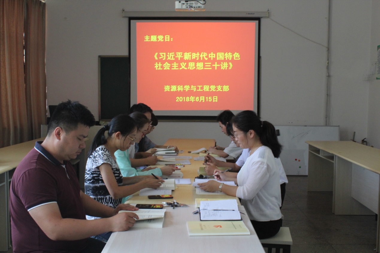 2018年6月5日,资源科学与工程党支部在油气工程学院2005举行六月份主题党日活动,组织全体党员集体学习《习近平新时代中国特色社会主义思想三十讲》,并以第一讲“新时代中国特色社会主义思想是党和国家必须长期坚持的指导思想”为内容开展主题党日,要紧密联系实际,深化学习效果,学懂弄通做实,把组织《三十讲》的学习与贯彻落实党的十九大精神和党中央决策部署结合起来,把学习成果转化为推动学校发展的强大动力。
