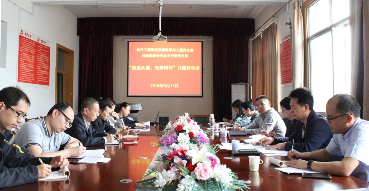 为进一步探索机关党组织与基层教学党组织组织联建、党员互动、活动互联、资源共享的有效途径,着力构建党建新格局,5月11日下午,油气工程学院资源科学与工程党支部与后勤保障处党总支行政党支部在油气工程学院会议室举行“堡垒共建、先锋同行” 党支部共建启动仪式。会议由油气工程学院党总支书记章志军主持。组织宣传处处长李汝湘、后勤保障处党总支书记王余宝、油气工程学院执行院长梁敬升、后勤保障处党总支行政党支部及资源科学与工程党支部全体党员参加了会议。