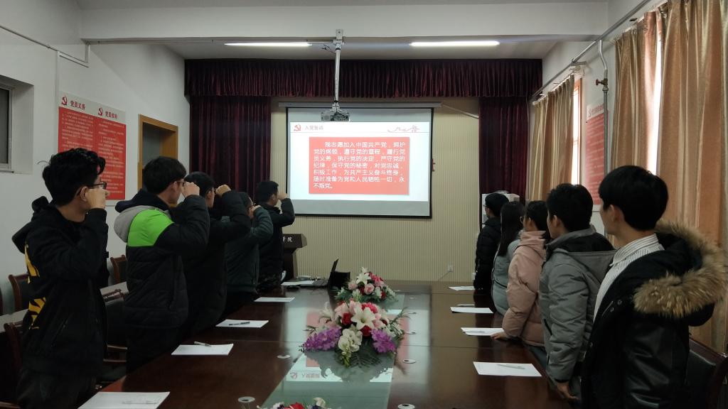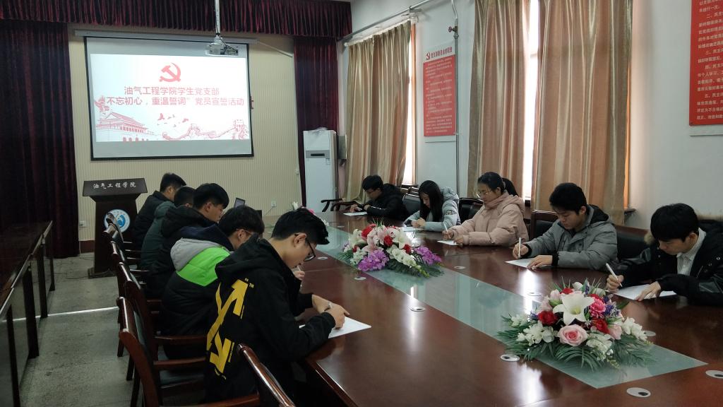 2018年12月11日,油气工程学院学生党支部于西配楼4004会议室举行“不忘初心,重温誓词”党员宣誓活动,学生党员王浩华、赵明月,学生预备党员李智等八名同志参加本次活动。