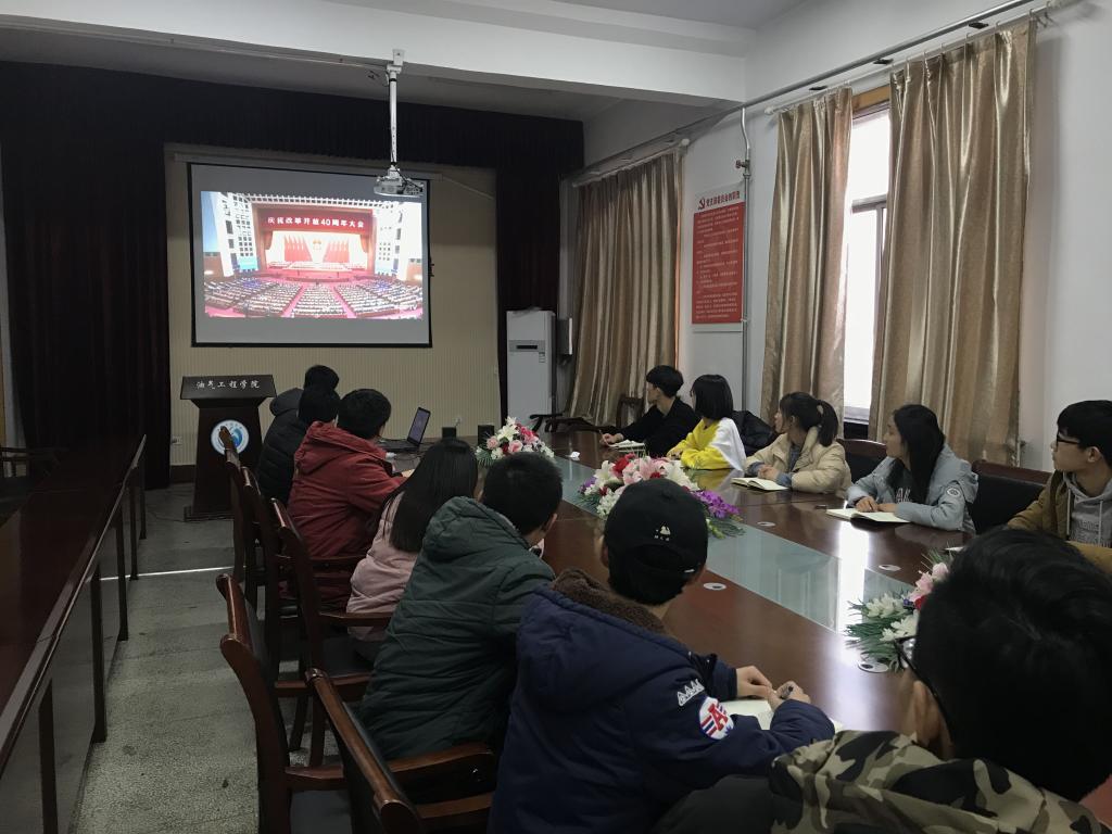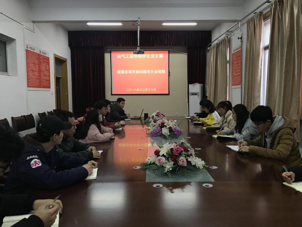 2018年12月18日,庆祝改革开放40周年大会在人民大会堂举行,油气工程学院学生党支部在西配楼4004会议室,集中收听观看大会盛况组织观看改革开放四十周年大会直播。聆听中共中央总书记、国家主席、中央军委主席习近平在大会上发表的重要讲话。
