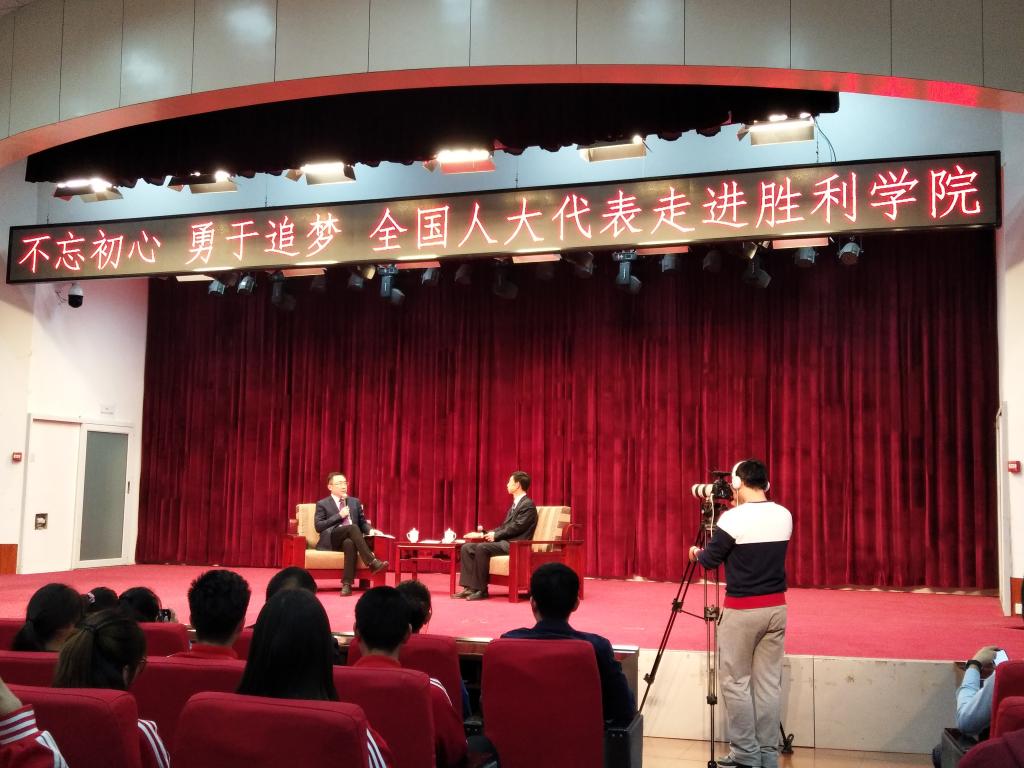 3月19日下午,全国人大代表张金海应邀做客东营电视台“伟伟道来”栏目,于我校100号学术报告厅进行了全国两会精神访谈,我院学生党支部党员、预备党员及入党积极分子参加,活动由组织宣传处副处长沙斌主持。