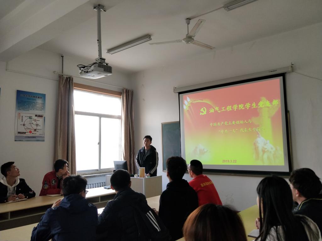 为迎接新中国成立70周年,坚定理想信念,培养中国特色社会主义接班人,3月22日下午,油气工程学院学生党支部在西配楼2005会议室开展“学党史,知党情,坚定理想信念”主题教育活动,学生党支部书记胡洪翠、支部全体党员及入党积极分子出席,会议由褚卫主持。