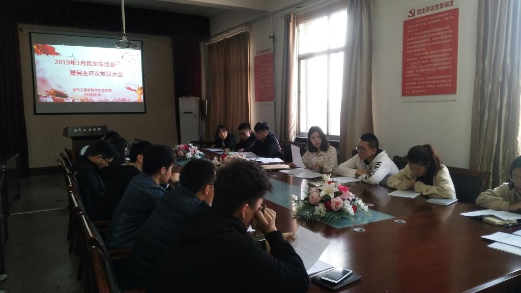 2019年3月26日,油气工程学院学生党支部在西配楼四楼会议室召开了民主生活会暨民主评议党员大会。学院学生党支部书记胡洪翠,支部全体学生党员及入党积极分子出席了会议。