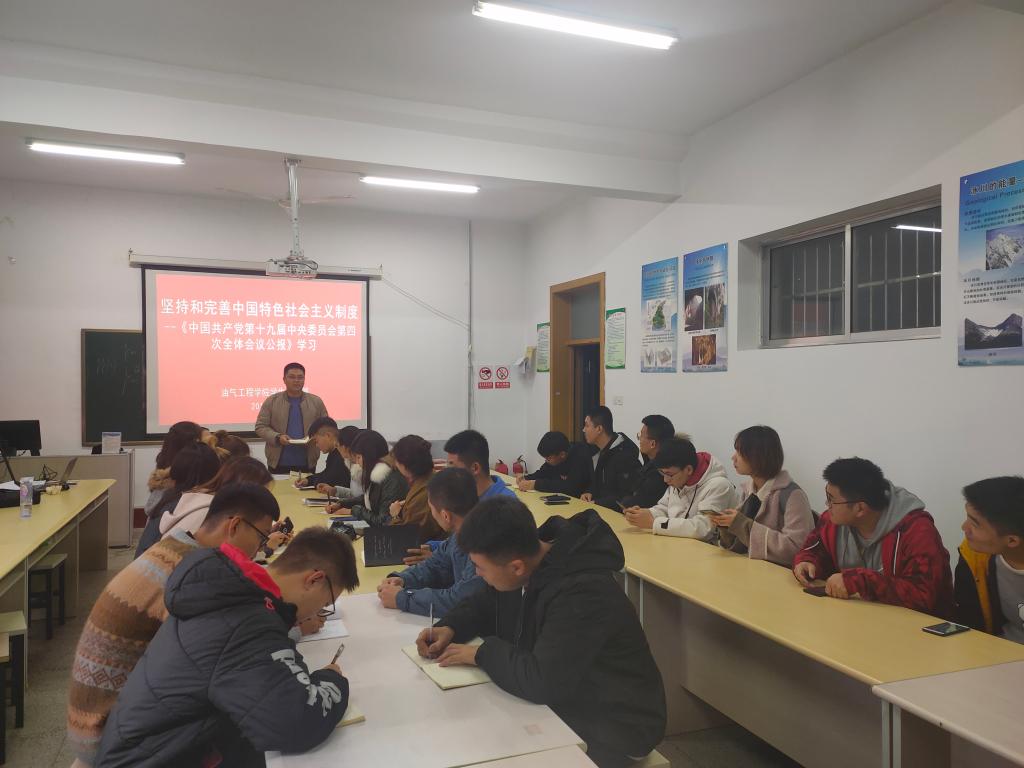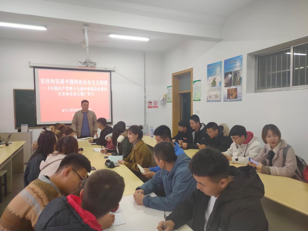 2019年11月19日,油气工程学院学生党支部在西配楼2003教室开展“坚持和完善社会主义制度”主题党日,会议由学生党支部书记王成主持,学生党支部全体党员参加。
