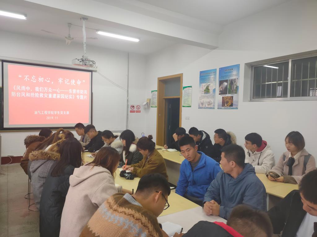 接着,党支部集体观看了《风雨中,我们万众一心——东营市防汛防台风和抢险救灾重建家园纪实》专题片,台风“利奇马”过境后,东营人和狂风暴雨作战,和台风抗衡,排除万难、冲锋陷阵,冒雨排除险情,紧急转移救护群众。此片彰显了我们优秀的中国共产党员的无私和奉献,无畏和大义,深刻诠释了中国共产党人不忘初心、牢记使命的执着和坚守,勇敢和担当。同志们认真观看了视频,心中感慨万千,学生党支部书记王成强调我们的党员以榜样的力量为前进的动力,不忘初心勇担当,齐心协力护家园,奋斗新时代,共筑中国梦。