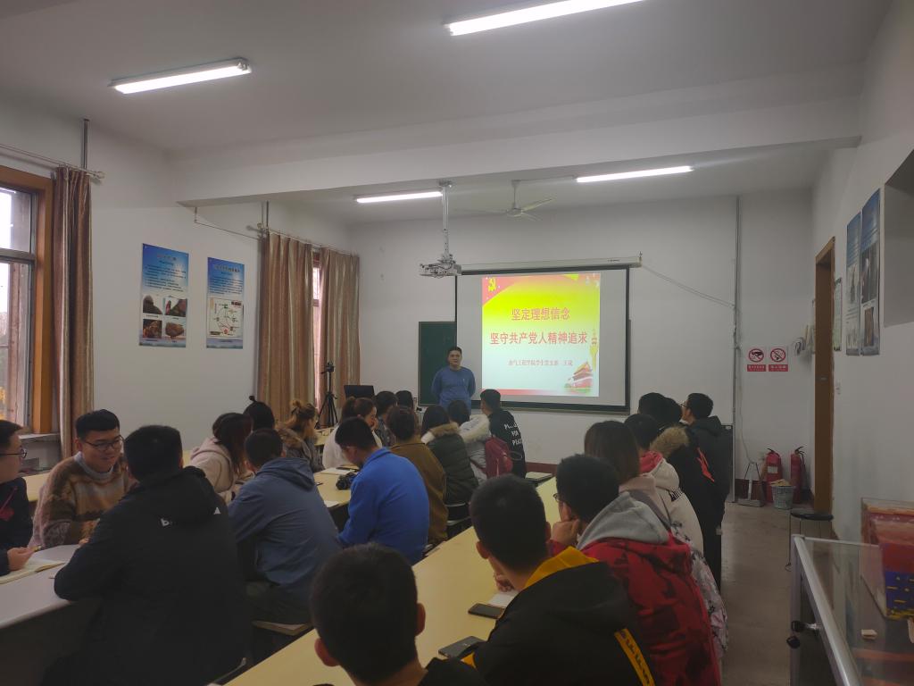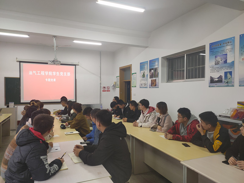 根据学校党委“不忘初心、牢记使命”主题教育部署安排,进一步提高党员的先进性,11月22日下午,在西配楼2005教室,油气工程学院学生党支部书记王成以《坚定理想信念,坚守共产党人的精神追求》为题,从“什么是共产主义理想”、“当前少数党员在理想信念方面存在的问题及原因”、“坚定理想信念,坚守精神追求,做一名合格的共产党员”三个方面,深入浅出地为学生党员上了一堂内容丰富、意义深刻的专题党课,油气工程学院学生党支部全体参加。