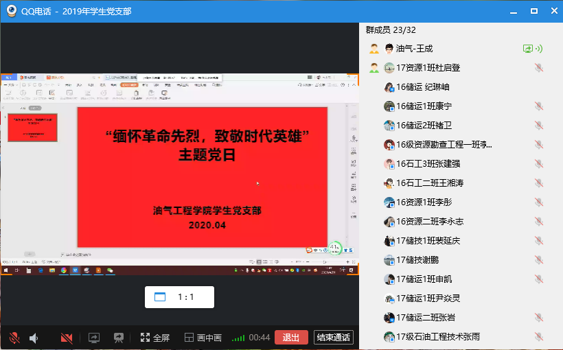 自新冠肺炎疫情发生以来,全国上下同心战疫,医生、护士、警察这些新时代英雄们,用行动书写了战役故事,在2020年这个特殊的清明节里,为更好地铭记英雄精神、学习英雄事迹、争做青年先锋,油气工程学院学生党支部于4月4日晚6点,开展线上“缅怀革命先烈,致敬时代英雄”主题党日活动,会议由党支部书记王成主持,支部全体党员同志参加。