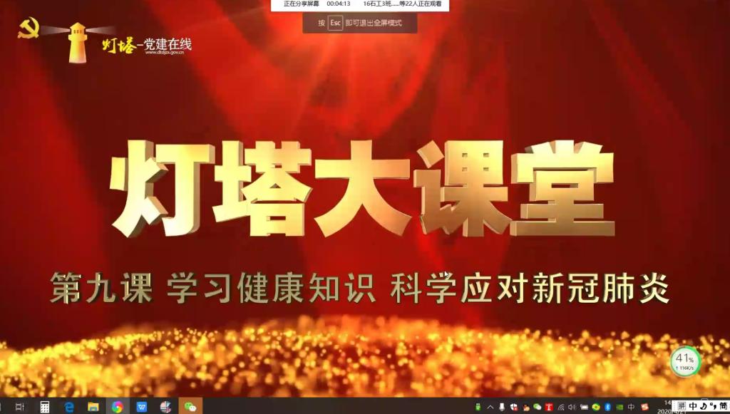 当前,国际疫情持续蔓延,我国防范疫情输入压力不断加大,为了自身和他人安全,仍需采取积极措施,做好个人防护。4月27号晚6点,油气工程学院学生党支部观看灯塔大课堂第九课《学习健康知识,科学应对新冠肺炎》,并积极组织党员在线探讨交流,发表感悟。会议由党支部书记王成主持,支部全体党员同志参加。