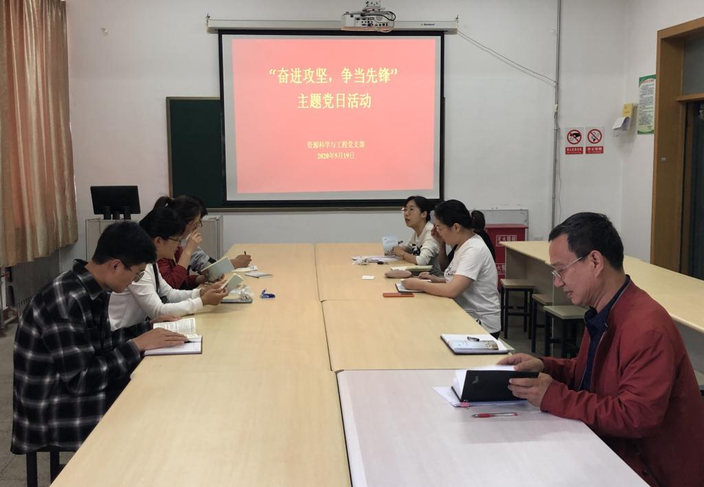 5月19日下午,资源科学与工程党支部在西配楼2005室举行“奋进攻坚、争当先锋”主题党日活动,会议由党支部书记胡秋媛主持。
