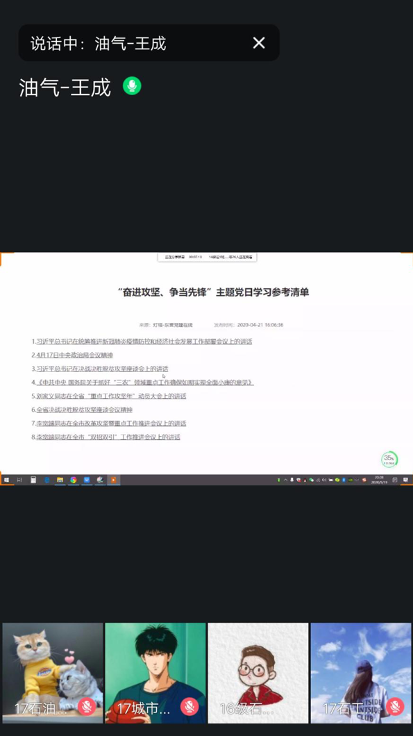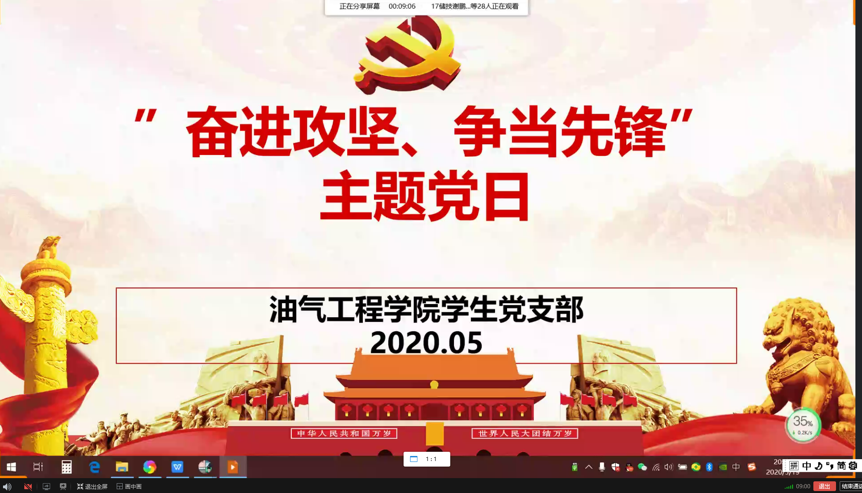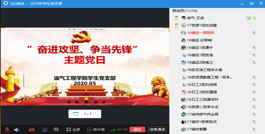 2020年5月19日晚7点,油气工程学院学生党支部在线上以视频会议的形式开展“奋进攻坚、争当先锋”主题党日活动,活动由党支部书记王成主持,支部全体党员参加。