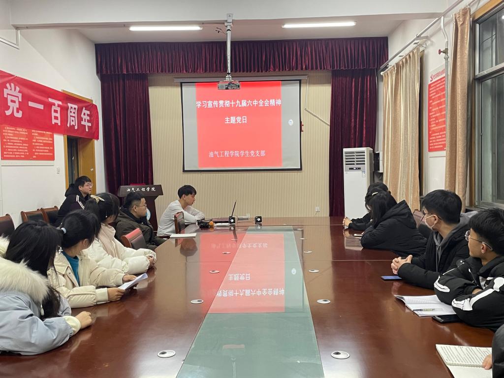 为深入贯彻学习党的十九届六中全会精神。12月22日下午,油气工程学院学生党支部组织全体成员,于西配楼4004会议室,开展集体学习,研讨党的十九届六中全会精神。