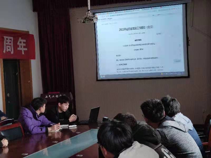 2022年2月24日下午,油气工程学院学生党支部全体成员在西配楼4004会议室集中学习了关于山东省第十三届人民代表大会第七次会议的政府工作报告。