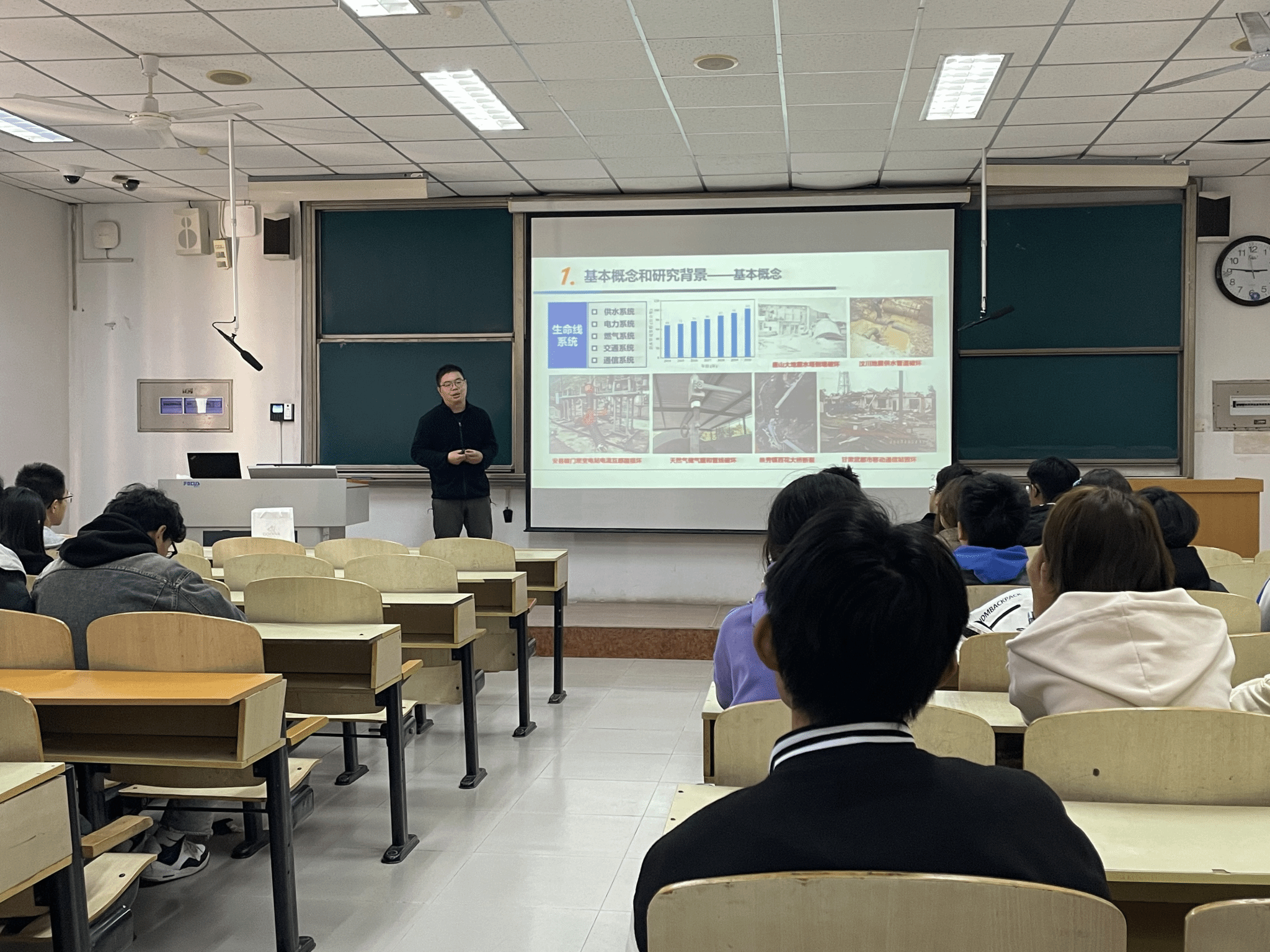 缪教授简要回顾了我国在城市生命线工程领域的研究和发展概况,在可靠性和韧性概念发展的背景之上,以城市供水系统、交通系统、供水-电力耦合系统等为例,介绍了报告人和团队在实验、理论、计算等领域的代表性成果。另外,缪教授还针对新能源科学与工程专业学生的就业方向和考研进行了有针对性的指导。