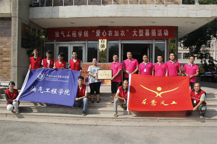 9月3日下午两时三十分,在中国石油大学胜利学院油气工程学院门口,胜利学院油气工程学院小水滴爱心志愿者服务队与东营市义工协会举行了简短而有意义的交接仪式,东营市义工协会为油气工程学院颁发了“东营义工爱心单位”证书,随后,“爱心衣加衣”物资转运车满载着同学们的爱心与希望启程,将1200余件衣物送到最需要它们的人们的手中。