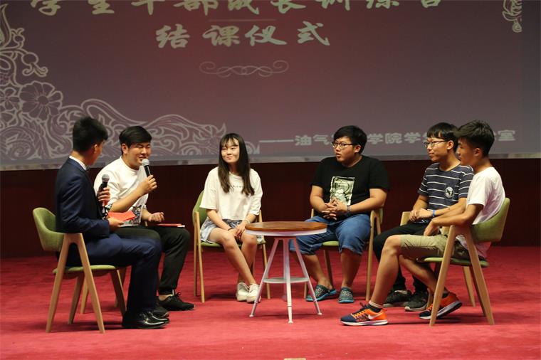 伴随着音乐,结课仪式正式拉开帷幕,主持人宣读了本学期优秀学生干部的名单,并由油气工程学院辅导员毕菲菲老师为获得优秀学生干部和优秀组织奖的同学们颁发证书。随后,主持人随机抽取了几位优秀学生干部,和他们进行了交流和沟通,沟通采取了主持人提问,学生干部们回答的方式,他们将本学期自己在参加活动和学习等方面所获得的经验和大家分享,观众们也都积极配合,全场陷入热烈地讨论之中。随着访谈的结束,仪式也将近尾声,最后在主持人的结束语中,仪式圆满结束。