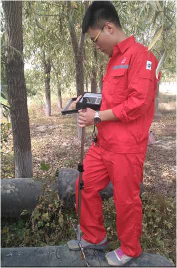 下午二时许,一行人乘车来到了位于六户镇邱家村的一处现场管道,杨博士介绍另一种全新的设备——管体畸变检测仪。这是一种2014年从俄罗斯进口的较为先进的检测仪器,能够在±125px的精度条件下,探清埋地管道的外腐蚀、应力集中等不利情况。在工人师傅的协助下,教师们对一条跨越河流的管道进行了现场检测。