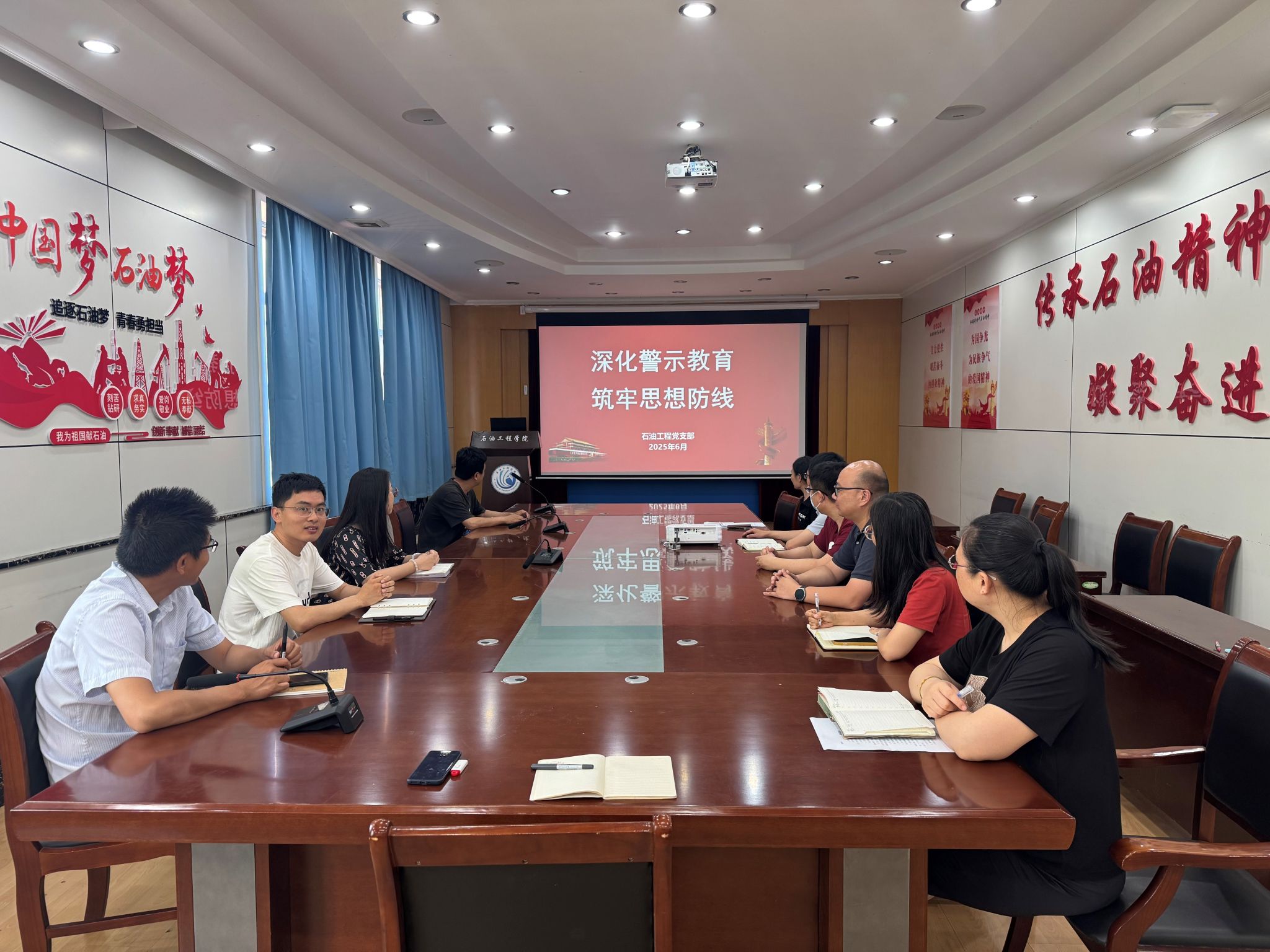 6月10日下午,石油工程党支部组织召开“深化警示教育 筑牢思想防线”为主题的警示教育会。会上,支部党员集中观看警示教育片,真实案例令人警醒。随后剖析典型案例,深入研讨交流。此次会议强化了党员纪律规矩意识,引导大家以案为鉴,筑牢廉洁防线,营造风清气正氛围。