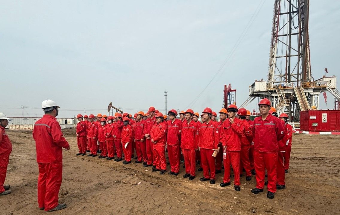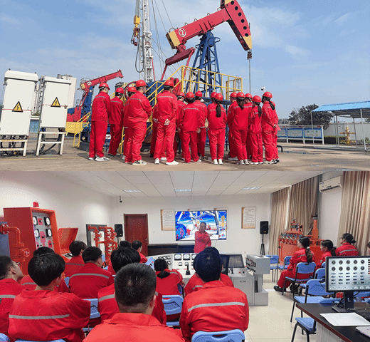 6月28日,在中石化胜利石油工程公司培训中心指导老师的带领下,2022级海洋油气工程学生前往野外钻井现场,酷暑炎热的井场中学习了钻井的具体施工流程和设备的运行过程。