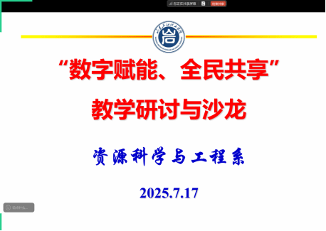 2025年7月17日上午,资源科学与工程系举办了以“数字赋能、全民共享”为主题的线上教学研讨会,资源系全体教师参会。会议聚焦省“师生数字素养与技能提升月”活动要求,集中展示并研讨了资源系两项AI融合创新应用教学案例。