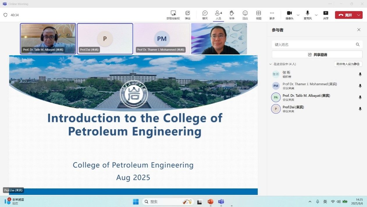 2025年8月6日,yl9193永利集团以线上形式同伊拉克科技大学就“油气流动保障与聚合物减阻技术”开展交流研讨。学院教师代晓东和张昕博士与伊拉克科技大学专家相聚云端,围绕减阻剂研发及绿色低碳储运展开深入交流。