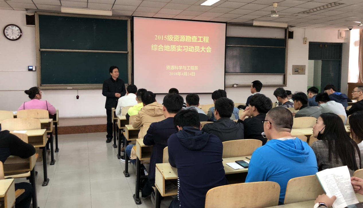 4月24日下午,我院资源科学与工程系在4教112召开2015级资源勘查工程专业综合地质实习动员大会。执行院长梁敬升、党总支书记章志军、副院长代晓东、资源系实习带队教师及2015级资源勘查工程全体学生参加了本次会议,会议由杨建磊老师主持。