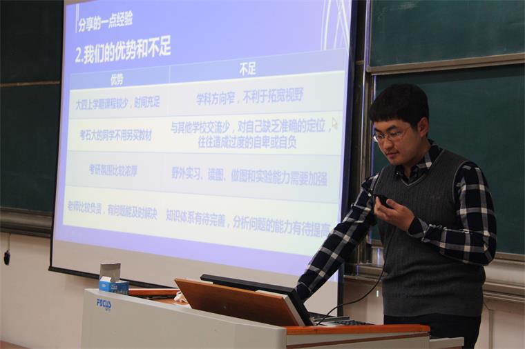 胡强结合2016年考研人数以及研招机构、报考专业、地区,讲解了目前考研形势;从培养方向、考试难度、培养模式、就业发展等方面深入浅出地讲解了学硕和专硕的区别,在“择校”、“备研”、“复试”等方面提出了宝贵建议。随后,来自2012级石油工程专业郭乔乔、油气储运工程专业施政灼、资源勘察工程专业马遵青分别从明确目标、复习策略、试题分析、考试注意事项、心态等方面分享了自己的考研感受和经验,号召大家“考研是一次拼搏,考研是一场守候,研途漫漫让我们携手风雨同行”。