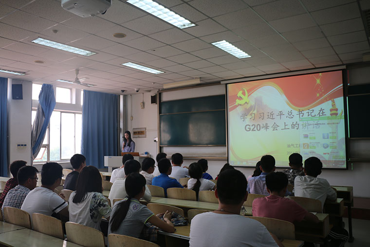 油气工程学院学生党支部于9月22日下午四点在四教303学习了习近平总书记在G20峰会上的讲话。本次会议由学生党支部组织委员丛煜佳同学主持,学生党员迟宏伟同学宣读会议内容。油气工程学院学生党员及入党积极分子参加了此次学习。