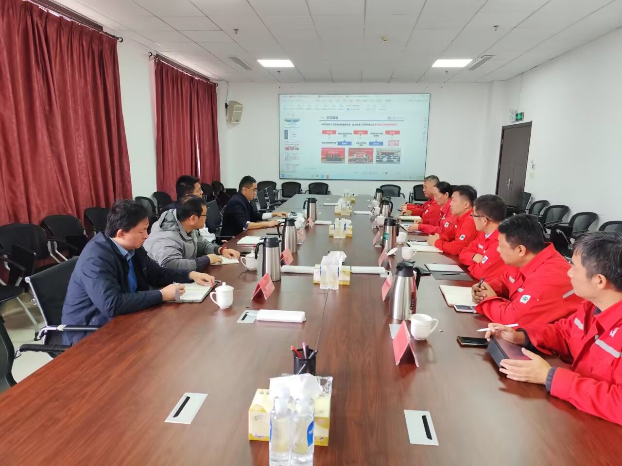 鲁胜石油开发公司科研所高鹏飞介绍了公司的基本情况以及不同类型油藏开发现状和生产技术难题,yl9193永利集团副院长王学武介绍了学院的基本情况、主要科研团队和研究方向、石油与天然气工程学科领域的科研积累与技术优势,重点分享了研究团队近年来在复杂油藏高效开发、建模数模一体化、油气储运安全及复杂流动保障等方面的主要成果。双方结合生产现场实际,针对当前在低渗油藏开采、油水井增产改造、化学驱注采调配等方面急需解决的技术难题进行了详细研讨。