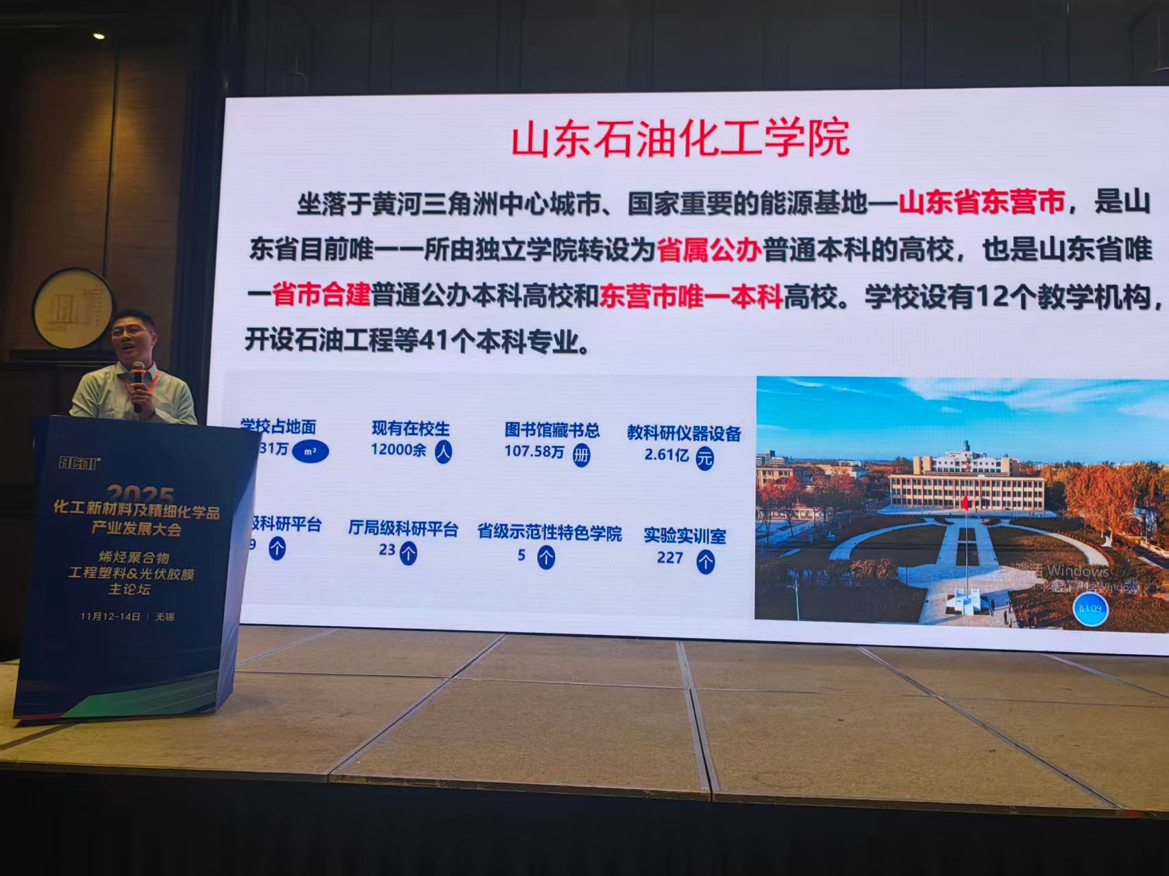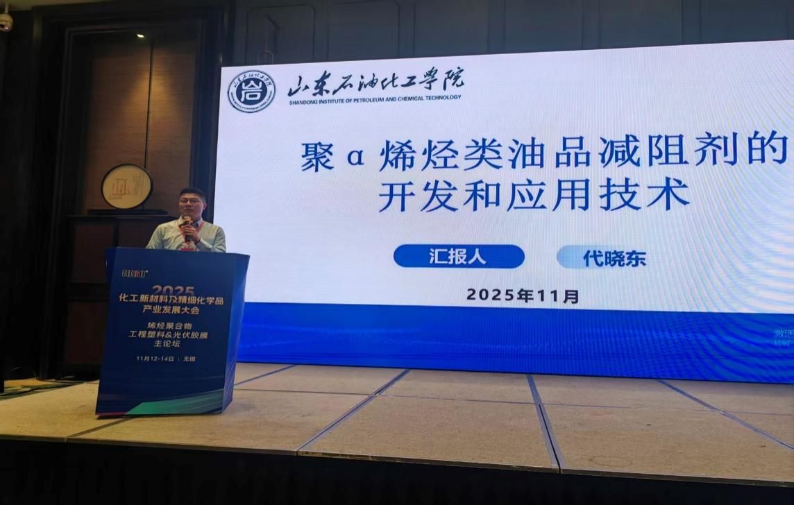 会上,代晓东院长以《聚α烯烃类油品减阻剂的开发和应用技术》为题,展示了我校在高性能聚烯烃材料领域的最新研究成果。该研究由我校“山东省高性能聚烯烃材料与循环利用重点实验室”提供支撑,其应用前景与大会聚焦的能源化工、新材料等国家战略需求高度契合,引发了与会专家的热烈讨论。