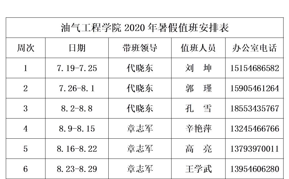 油气工程学院2020年暑假值班安排表