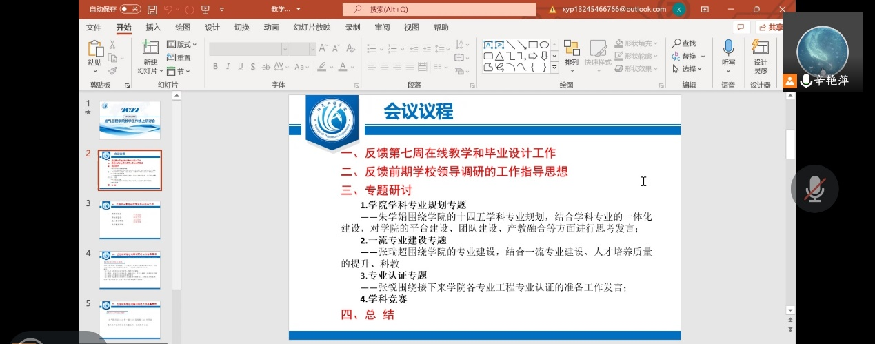 辛艳萍就第七周线上教学和毕业设计工作中出现的问题进行反馈。学院通过线上教师座谈会、学生座谈会、线上督导听课以及线下教室巡课等方式对线上教学和毕业设计工作进行了督导,有效地保证了教学效果。
