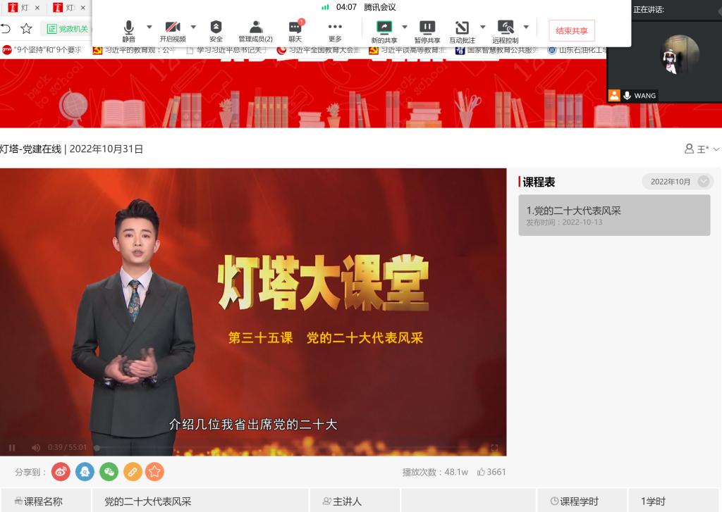 10月18日,资源科学与工程党支部组织召开党的二十大精神专题学习会议。会议由党支部书记胡秋媛主持,全体党员集体学习了党的二十大报告有关重要论述。通过学习,教师纷纷表示,党的二十大报告为我们的工作提供了根本遵循和行动指引,下一步要全面贯彻落实党的二十大精神,坚定信心、笃行实干,高标准高质量完成学院各项工作任务,全力推动学院工作再上新台阶。10月25日,资源科学与工程党支部开展线上学习,集体观看了灯塔大课堂第35课《党的二十大代表风采》。