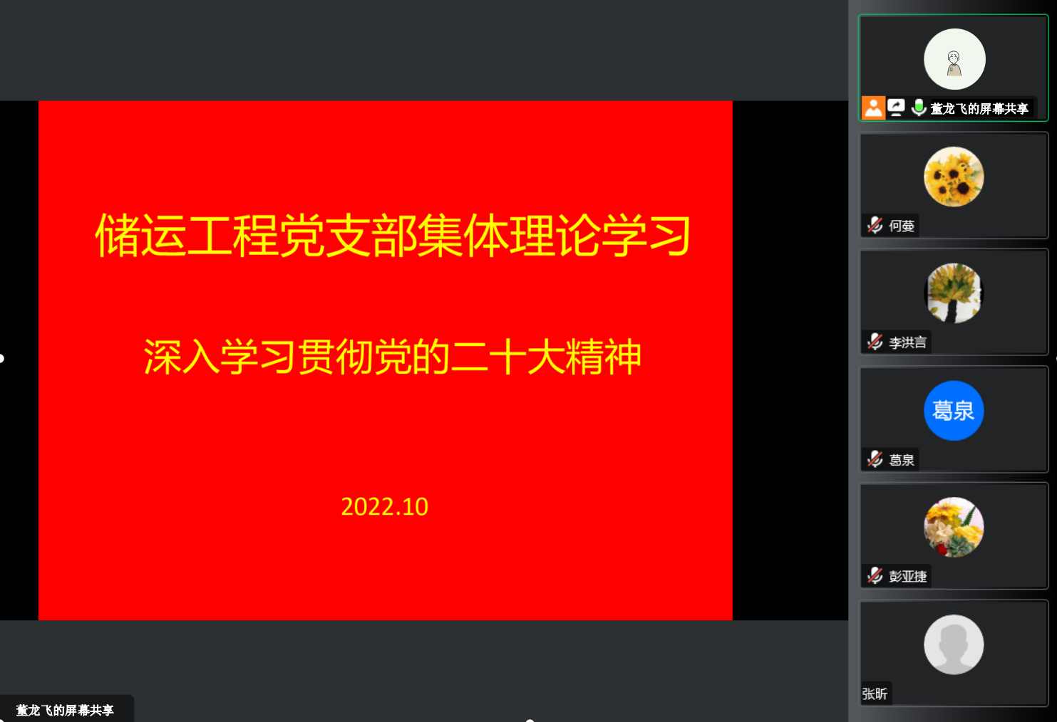 10月27日,储运工程党支部组织线上专题学习会议,学习了习近平总书记在党的二十大闭幕会上的重要讲话精神,《中国共产党章程(修正案)》、党的十九届七中全会公报和中央纪委工作报告的主要内容。