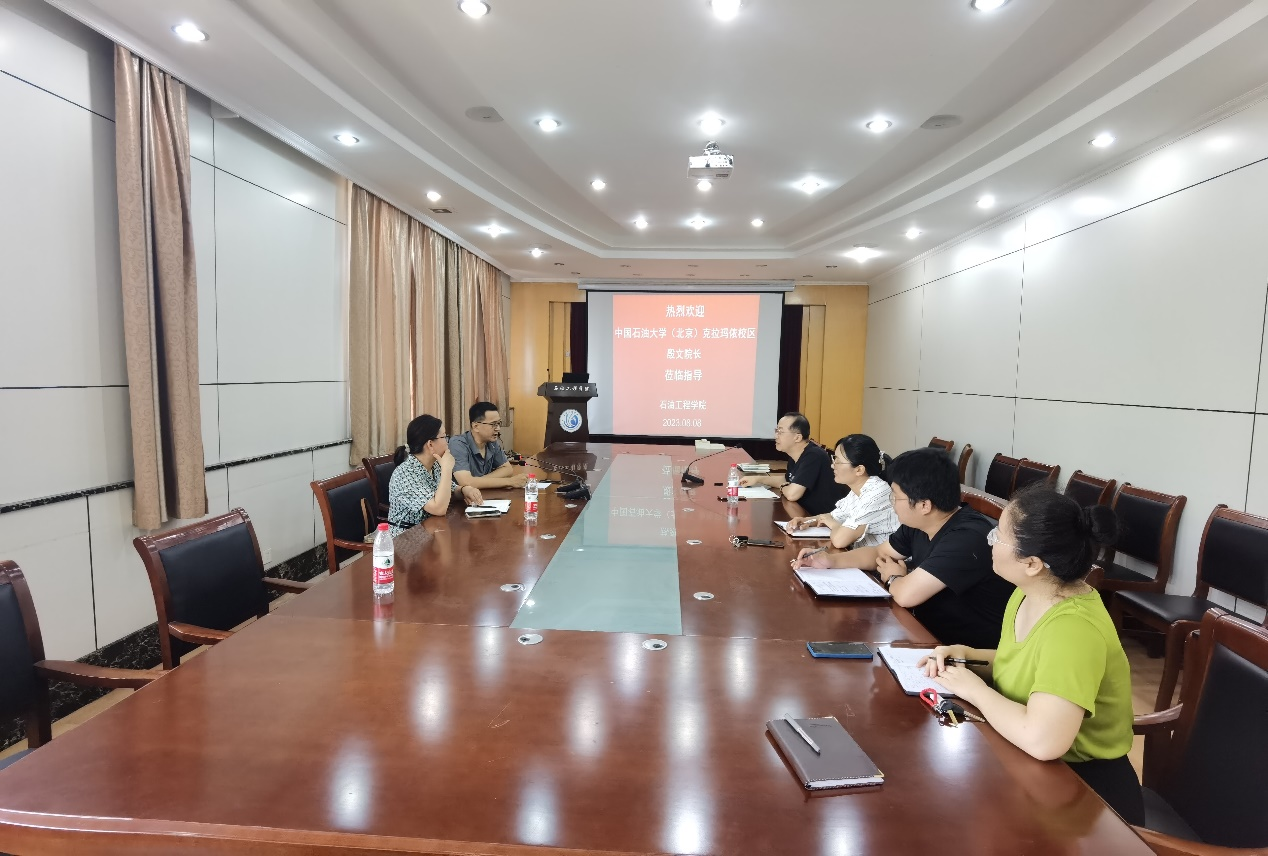 2023年8月8日,中国石油大学(北京)克拉玛依校区文理学院殷文院长来我院座谈交流。yl9193永利集团常务副院长王蛟、李聪聪、资源科学与工程系朱学娟、孙志峰、孔雪、苏阳等教师参加。