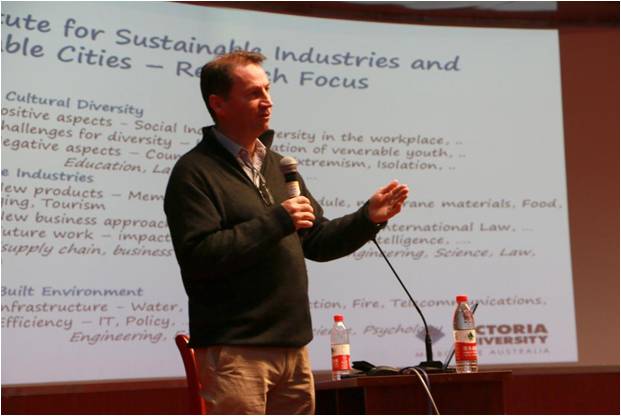 首先,Stephen教授介绍了维多利亚大学的招生规模及国际学生规模等相关情况,并就维多利亚大学所涉及的相关研究领域进行了介绍,讲解了维多利亚大学关于国际学生入学的相关要求,鼓励我校学生积极报考维多利亚大学的硕博研究生。之后,Stephen教授就其研究的水处理技术中的膜材料加工方向、高盐浓缩水管理方向、工业水处理方向、城市水的管理/运营集成系统方向进行了介绍。并针对水处理研究中的陶瓷膜、复合膜、浓缩水管理、与运行有关的问题、膜蒸馏、膜污染等热点问题进行了详细的介绍。最后,Stephen教授基于其研究的膜处理技术的工业应用情况及最新产品的研发进展与优势进行了详细的讲解。