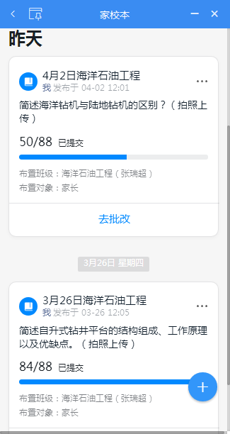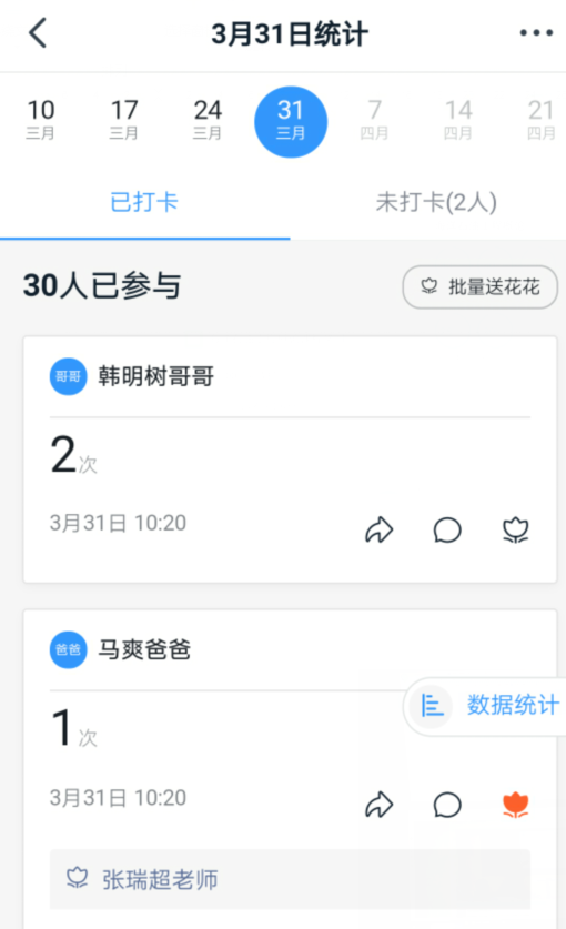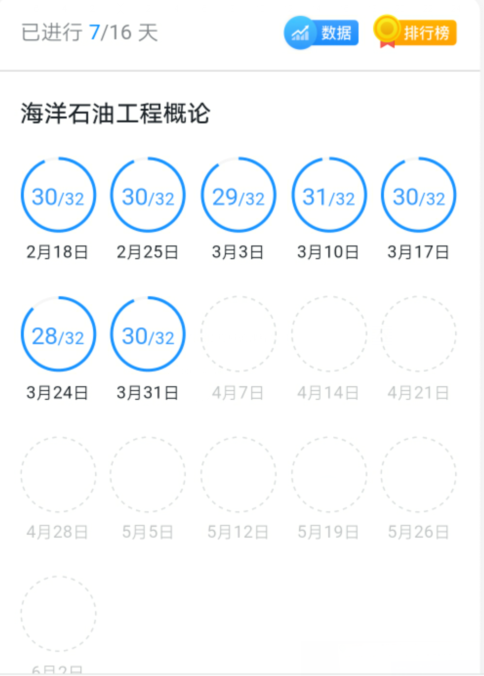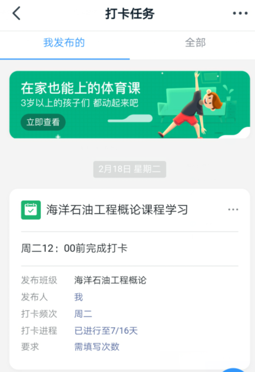 钉钉群内,具有打卡功能,可以设置自定义打卡,比如我的海洋石油工程概论课程为每周二上午三四节,我就设置了打卡任务,因为我是32课时的课程,所以设置了16次,每次打卡为周二10:10之前完成打卡,设置好提醒时间之后每周二9:50系统会自动在班级群里弹出打卡信息提示学生打卡。学生每次打卡系统都会统一记录打卡时间和次数,教师可随时查看打卡信息,也支持批量导出,帮助教师完成平时成绩的给定。