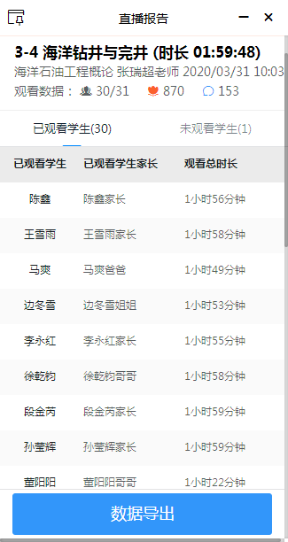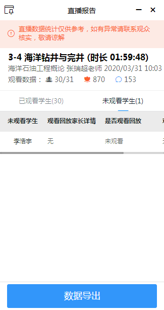 直播结束后,我们还可以通过最后的直播报告了解学生看了多久的直播(或没观看直播的是否观看了回放),能够为我们下一次上课多注意哪些学生提供了依据,也可以帮助我们了解每一位学生的课程学习情况。