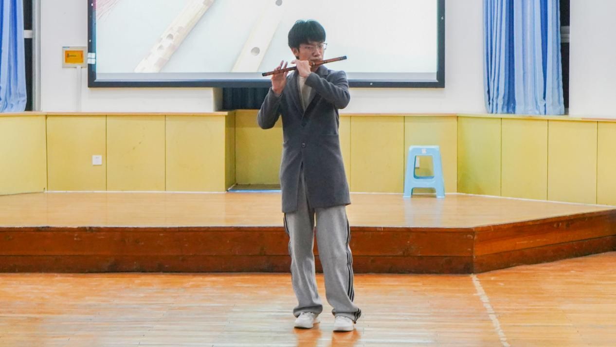 任奥博同学带来了竹笛演奏《生生世世爱》,竹笛搭配古风旋律,婉转悠扬,交织出宿命轮回的震颤。现场灯光柔和地洒下,营造出一片温馨浪漫的氛围。