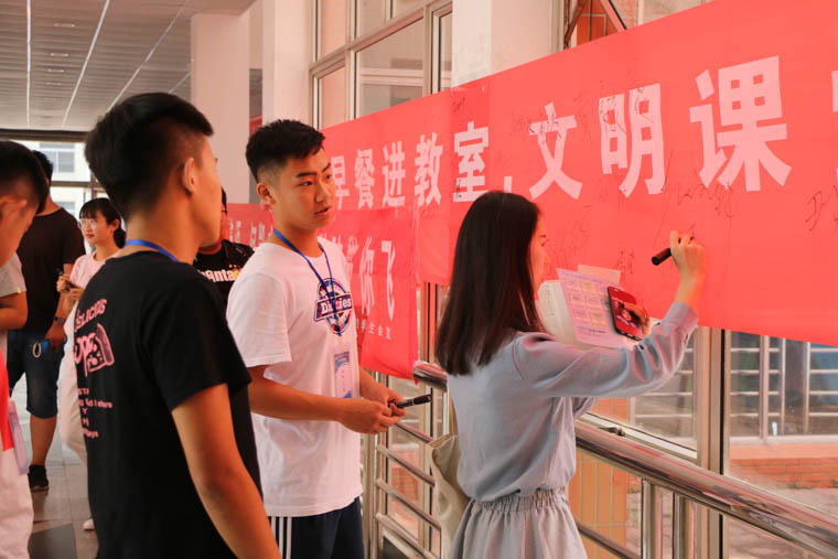 6月11日上午,我院在第四教学楼大厅成功举办“拒绝早餐进教室,文明课堂我先行”条幅签字仪式活动,我院辅导员老师及学生干部高度重视,各年级各专业班委均积极参与本次活动。