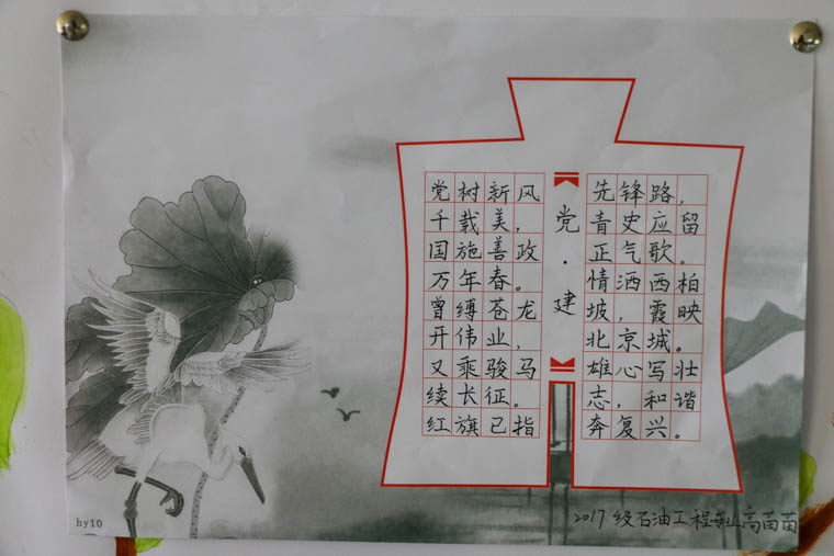 在活动最后,油气工程学院辅导员对作品进行筛选,评定出15份优秀作品,对相应获奖同学颁发丰厚奖品,并将作品展览在西配楼大厅。
