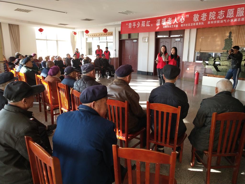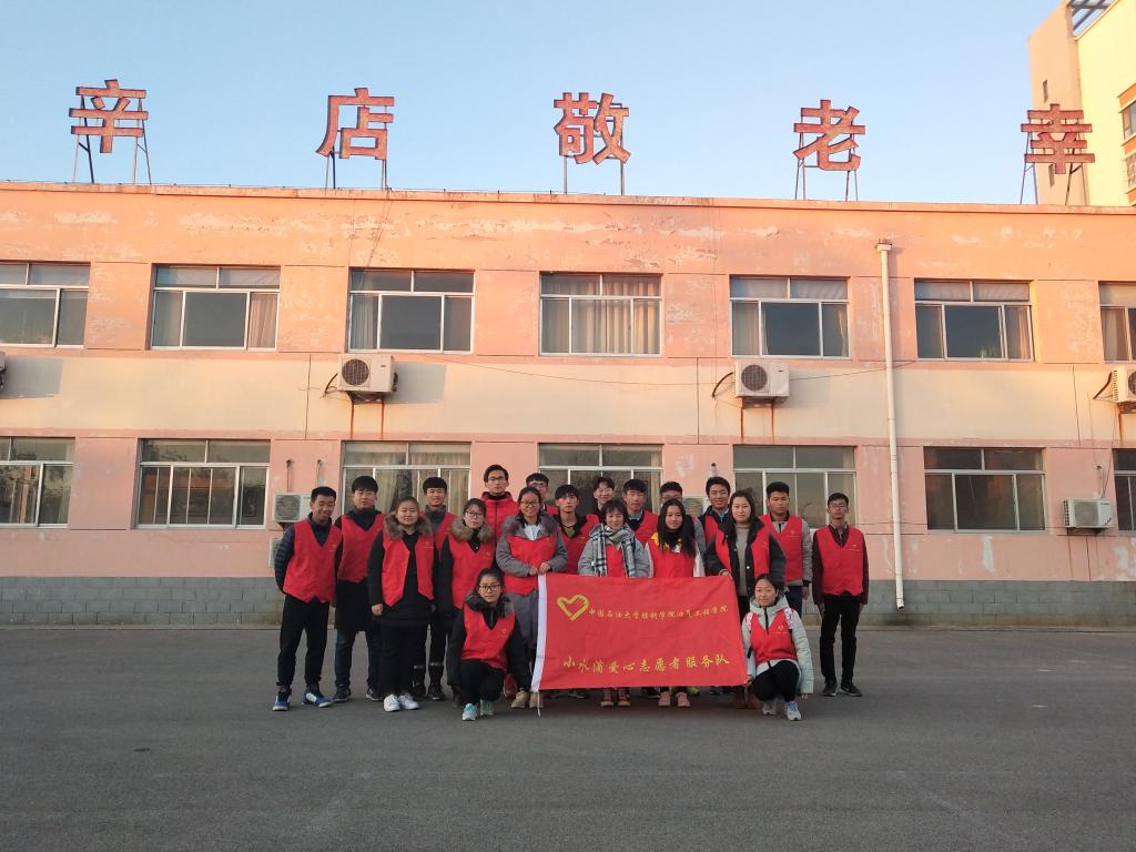 2017年11月18日下午,油气工程学院小水滴爱心志愿者服务队和学院学生党支部来到了辛店街道敬老院,开展了将近两个小时的敬老爱老志愿活动。此次活动旨在向敬老院的孤寡老人献出志愿者们的热情和祝福,在寒冷的冬天给他们送去一份关爱与温暖。
