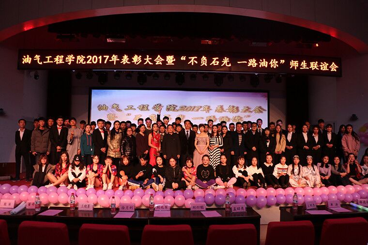 2017年12月24日,油气工程学院在100号学术报告厅举办了2017年表彰大会暨“不负石光 一路油你”师生联谊会。出席本次联谊会的有中国石油大学校长助理、胜利学院院长刘衍聪,党委副书记孟昭亮,副院长徐月利,纪委书记王照杰,副院长王晓勇,组织宣传处处长李汝湘,化工的院长吴明银、书记侯曙光,文经的院长薛德枢、书记周向军,教艺的书记张超,基础的院长董希文,护理的院长赵森、书记姚梅,老年中心主任殷丽以及来自各职属部门、各教学院的领导、老师们。