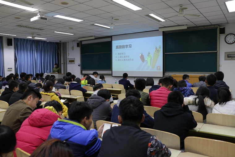 为激发学生的学习热情与动力,树立正确的学习目的,创造良好的学习氛围,11月14日晚,学生会学习部在第四教学楼103教室举办了学业安全讲座。此次活动特邀了2016级王欣、高翔、张济妮、姚帅其、李少钦五名学习成绩名列前茅的同学进行交流,学生会、团总支各部门主要骨干以及2017级一百余名新生出席。