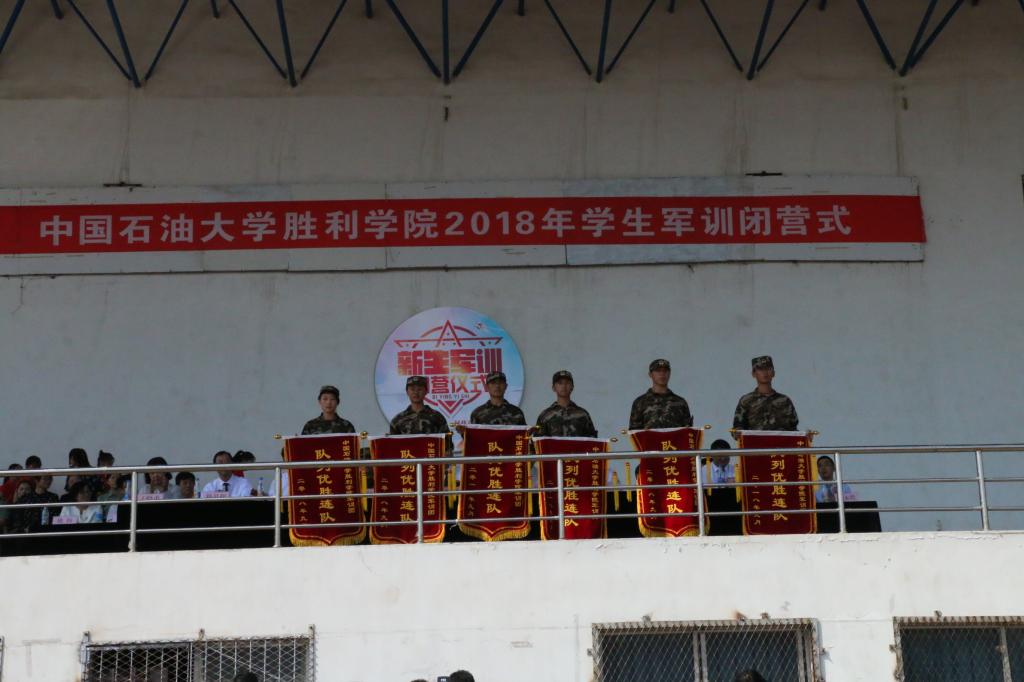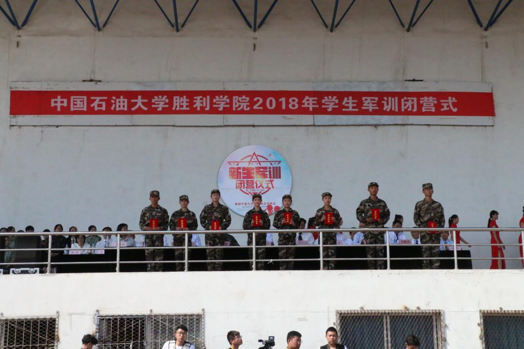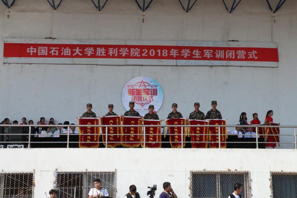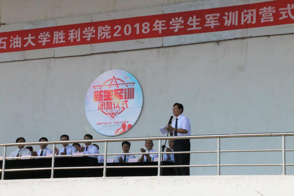 2018年9月29日上午,中国石油大学胜利学院2018级新生军训闭营式在石大体育场隆重举行。学校领导刘衍聪、孙学斋、孟昭亮、赫正、徐月利、王照杰、王晓勇,东营市武装支队参谋长袁驰、各教学院及相关职能部门负责人也出席了闭营式。闭营式由党委书记孙学斋主持。